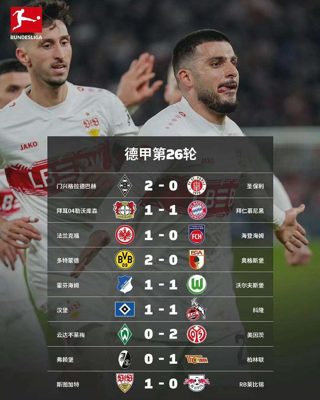 随着北京时间3月16日凌晨进行的欧冠席位的关键争夺战中,斯图加特1比0力克莱比锡,德甲第26轮全部比赛全部结束。被罚下2人的拜仁慕尼黑,在客场1比1艰难逼平勒沃库森;而多特蒙德2比0击退前来造访的奥格斯堡,将与拜仁的分差缩小至9分;霍芬海姆战平沃尔夫斯堡后积50分,而斯图加特赢球后积分...